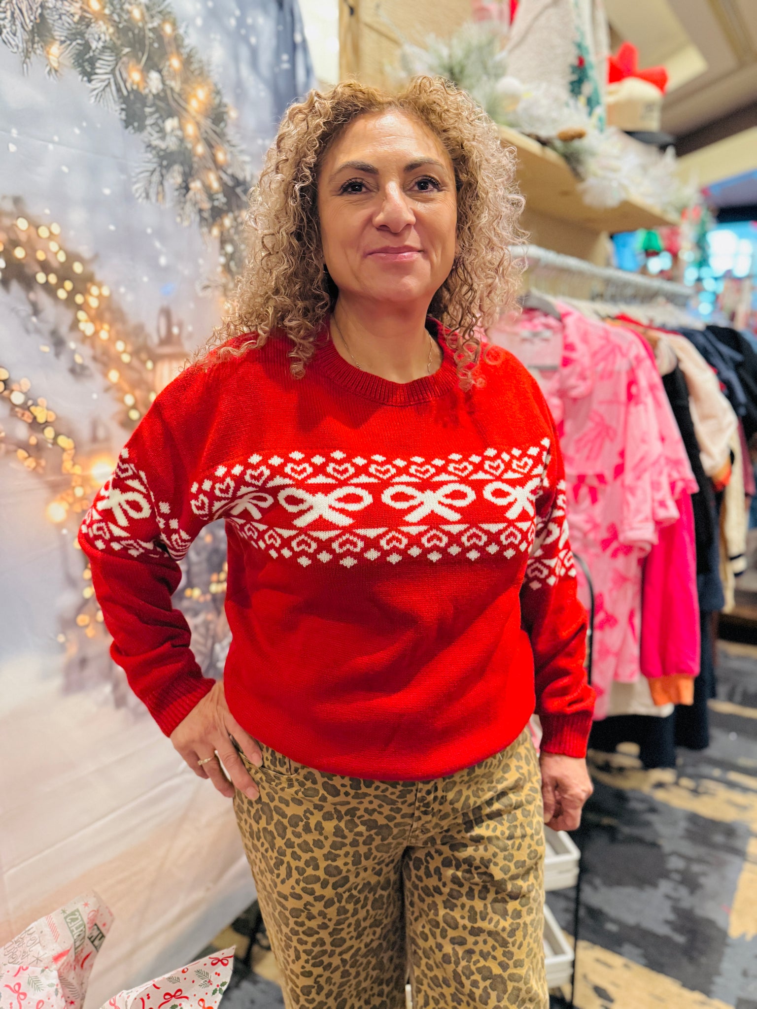 Add a touch of charm to your winter wardrobe with our Jingle Bow Red Knit Sweater! This cozy classic features a timeless Fair Isle pattern accented with sweet bow details that bring a feminine twist to the traditional holiday knit. The soft, midweight fabric keeps you warm without feeling bulky, making it perfect for all your festive plans. Pair it with jeans and boots for a casual holiday brunch or style it with a skirt and tights for a chic Christmas party look. Perfect for seasonal photos and winter outings.